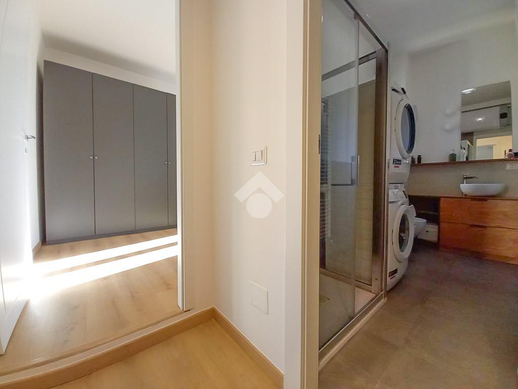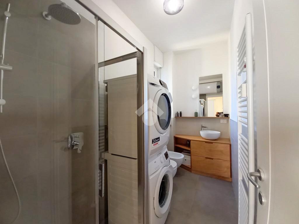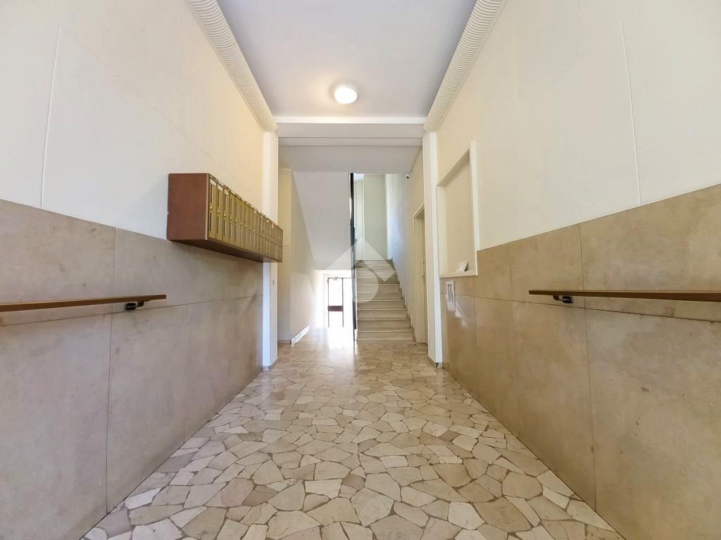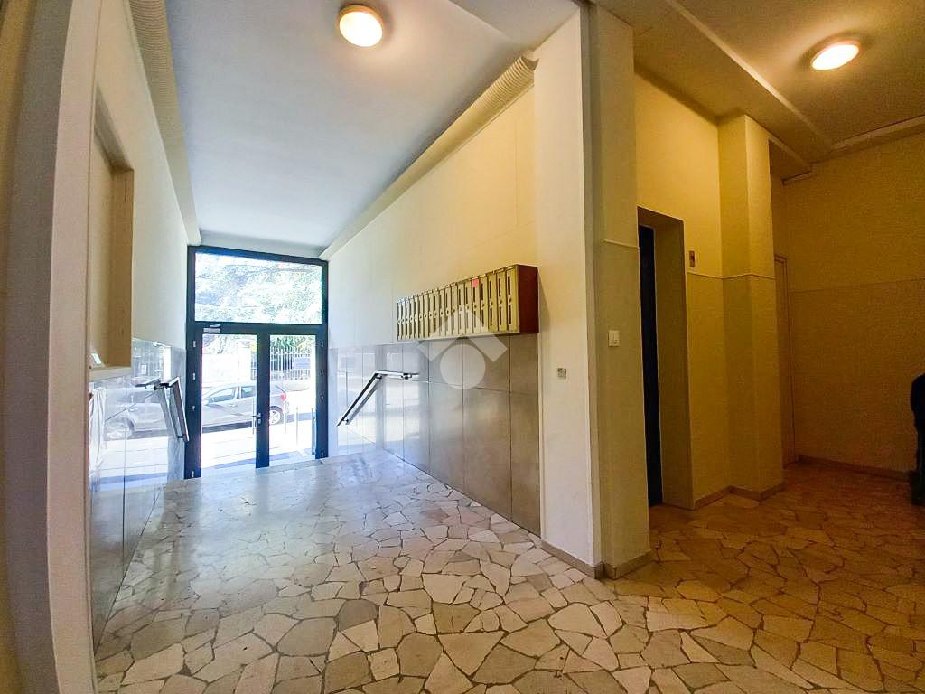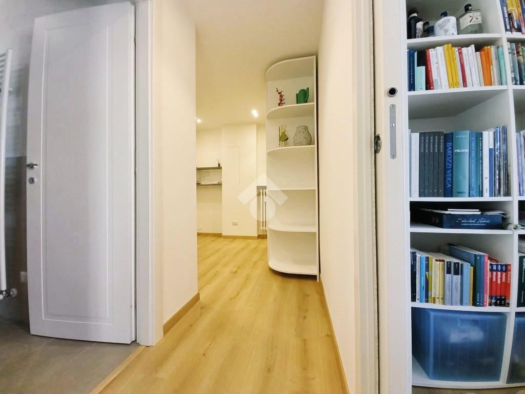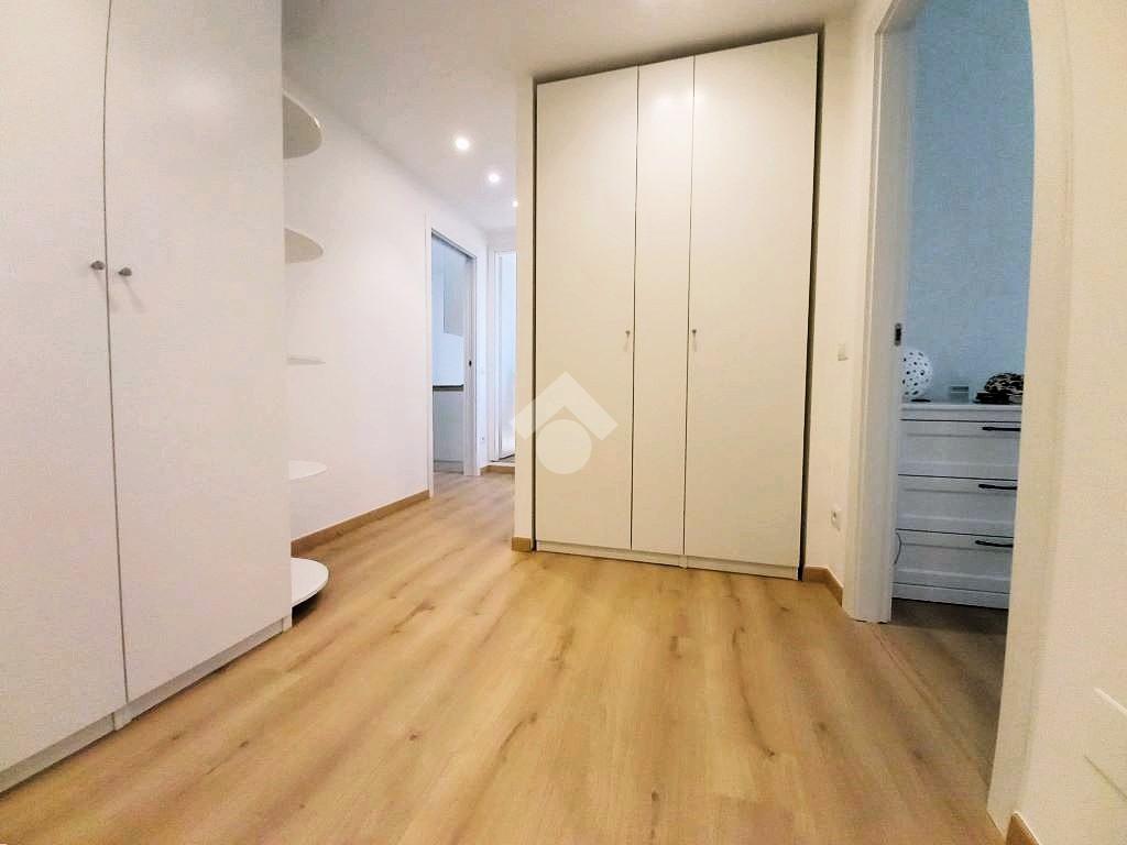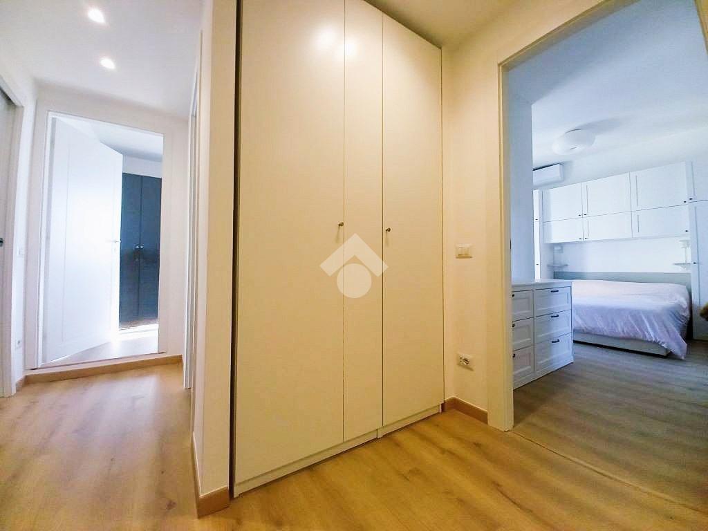 Il vano d’ingresso, modernamente rinnovato dall’abbassamento con illuminazione a faretti, è ben sfruttato da utili armadi su misura; il bagno è provvisto di sanitari sospesi, comodo box doccia in cristallo, attacco lavatrice/asciugatrice e pratico mobile sottolavabo anch’esso su misura.