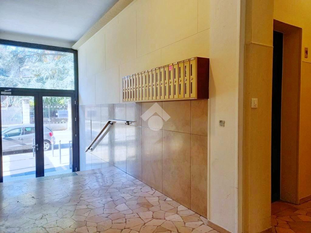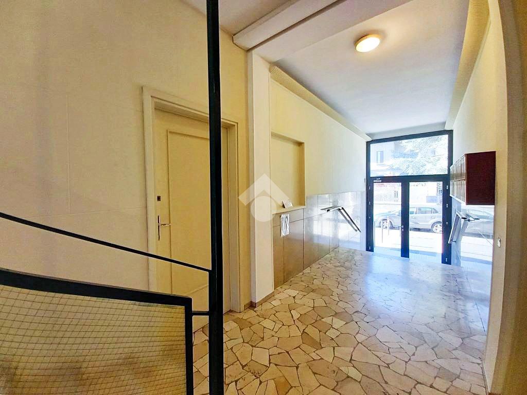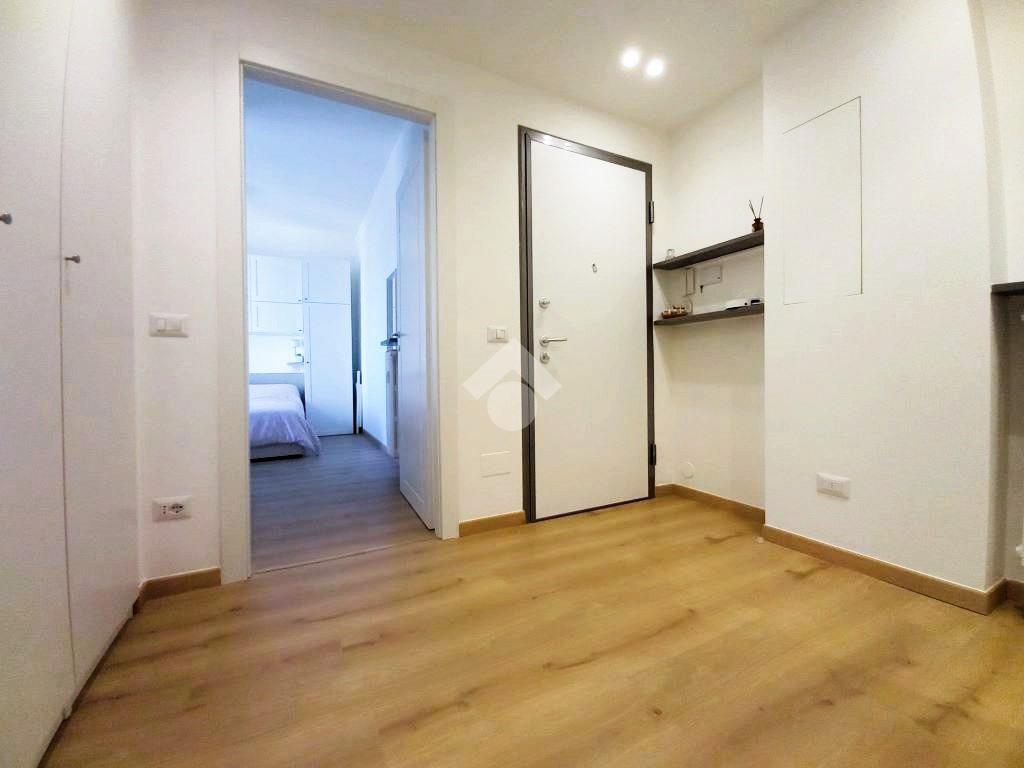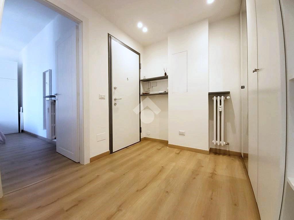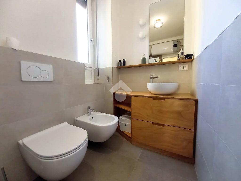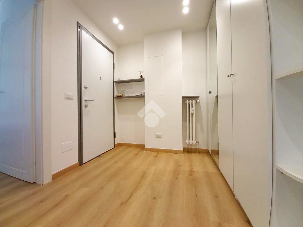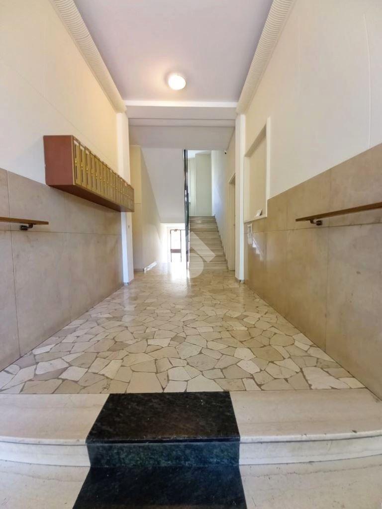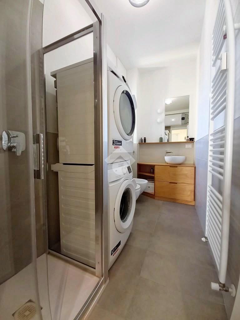 Il vano d’ingresso, modernamente rinnovato dall’abbassamento con illuminazione a faretti, è ben sfruttato da utili armadi su misura; il bagno è provvisto di sanitari sospesi, comodo box doccia in cristallo, attacco lavatrice/asciugatrice e pratico mobile sottolavabo anch’esso su misura.