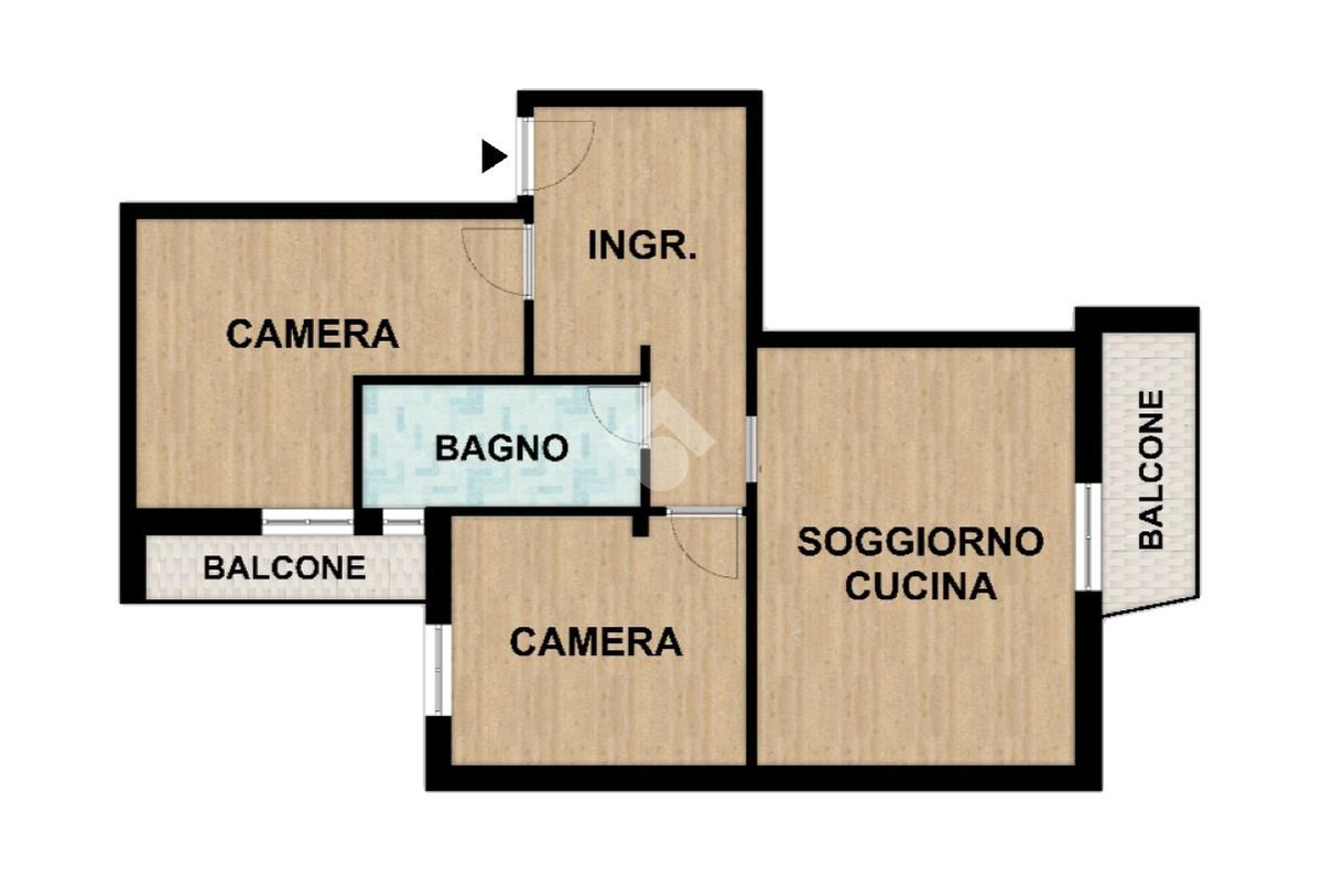 All’interno si compone di un ampio disimpegno d’ingresso su cui si articolano tutti i locali: il soggiorno dotato di angolo cottura e balcone coperto (4 mq), la camera matrimoniale accessoriata di un secondo balcone (2,5 mq) con vista panoramica aperta sul paese e sui monti, la cameretta ed il bagno finestrato.