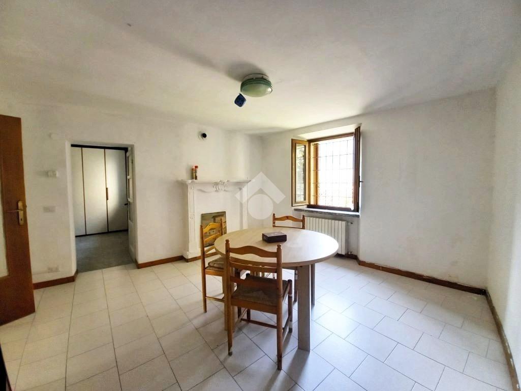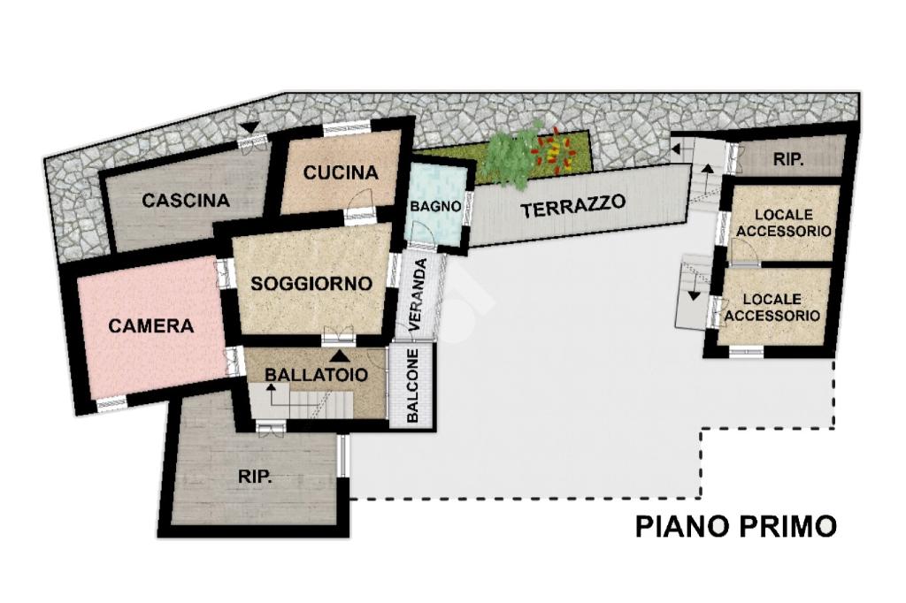 - piano primo (80 mq ): accesso da vano scala indipendente, ballatoio d'ingresso, soggiorno con balcone verandato, cucina con camino, ampia camera da letto, bagno finestrato con vasca e due vani accessori attigui all'appartamento (ripostiglio sottotetto e cascina/legnaia);